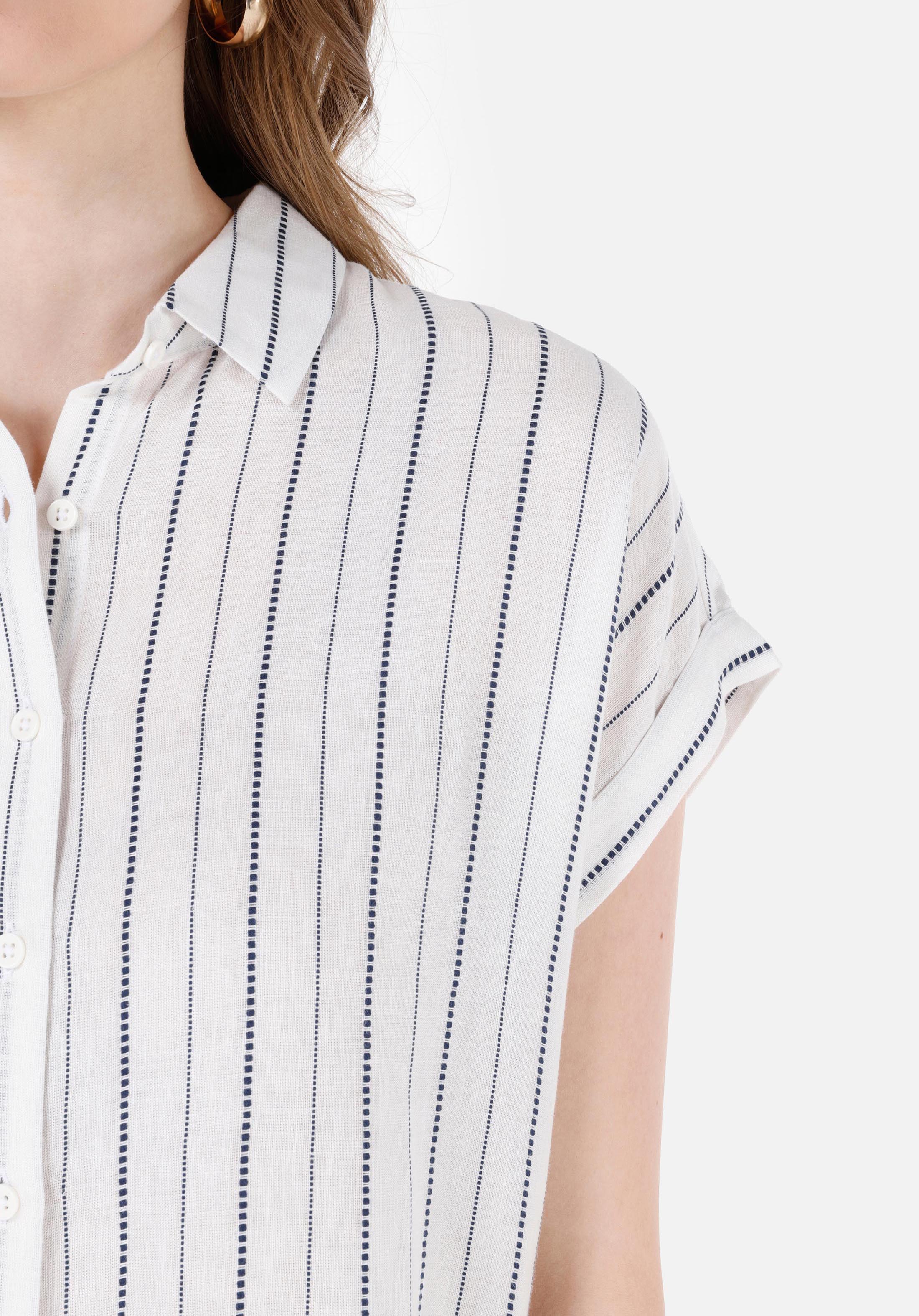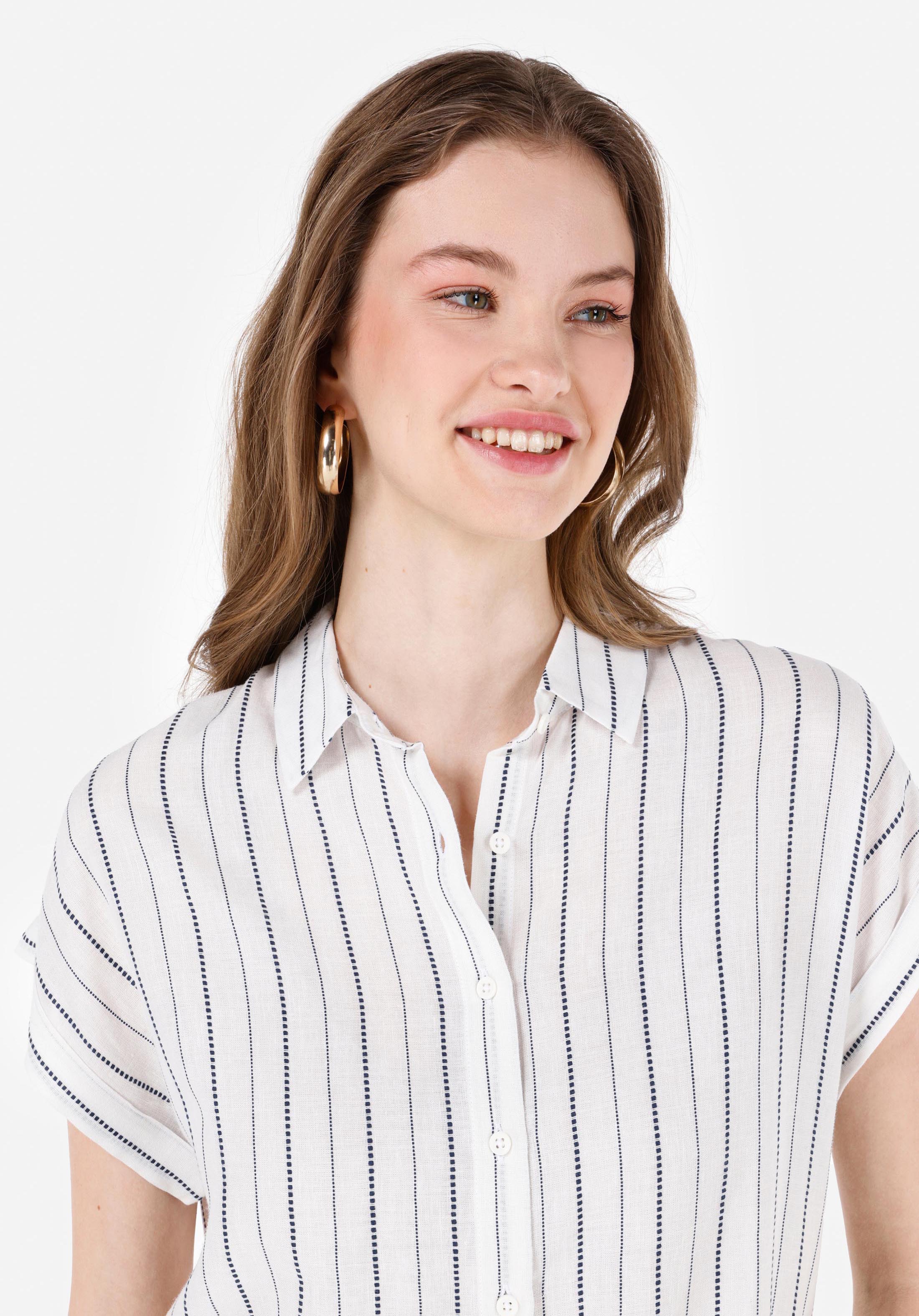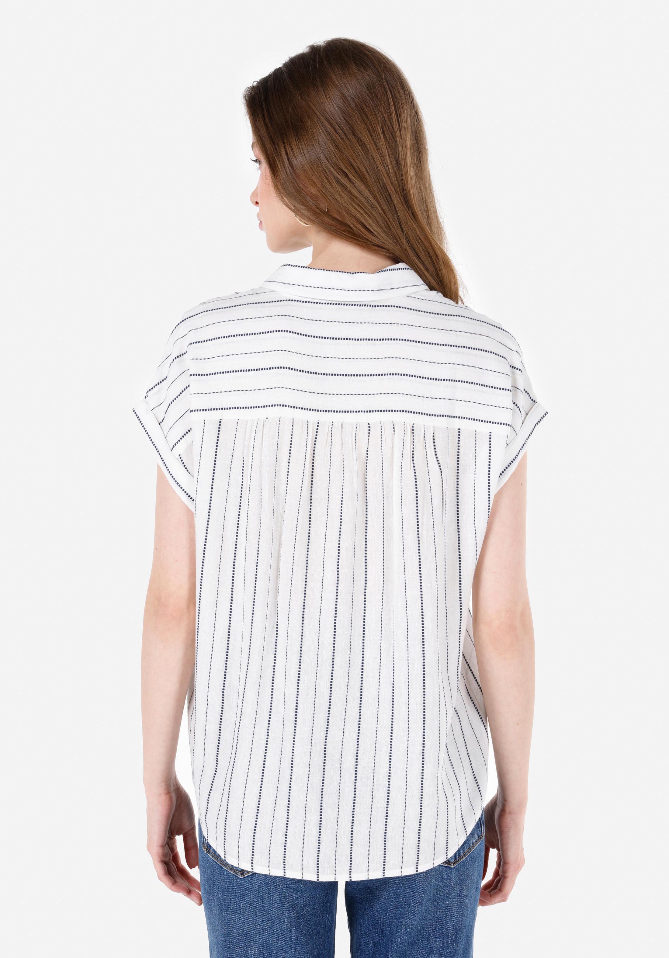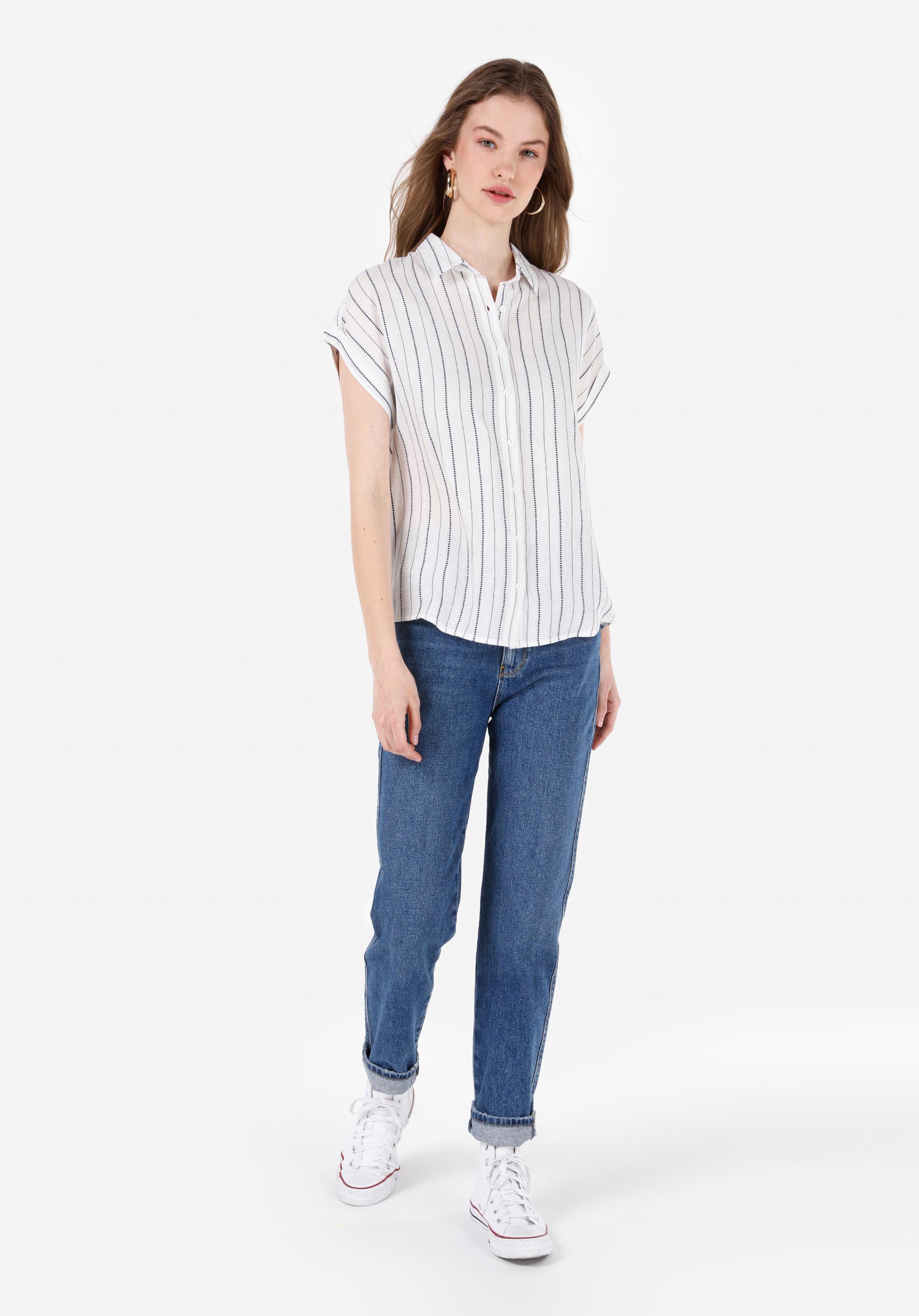 قميص نسائي أبيض مخطط بياقة عادية قصير الذراع