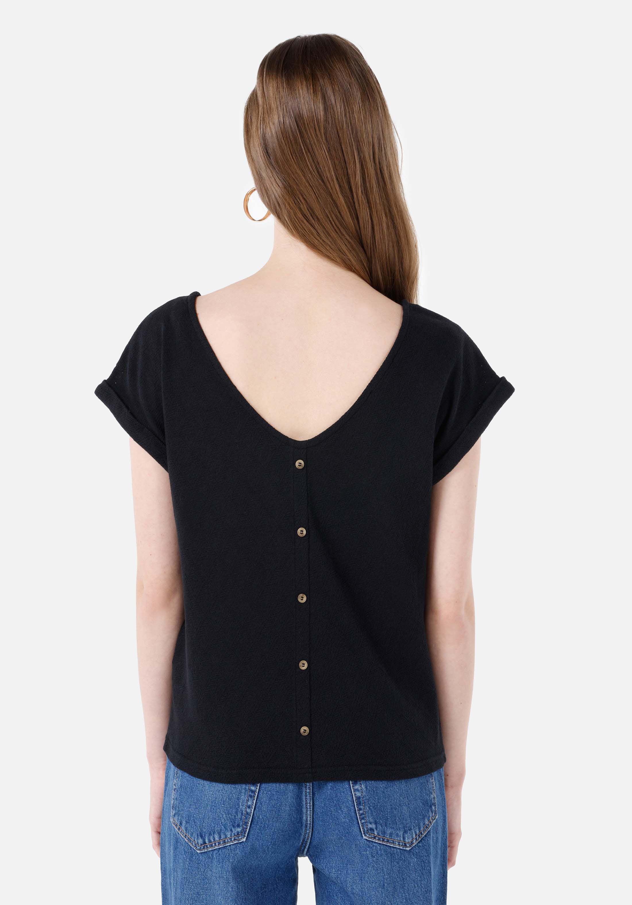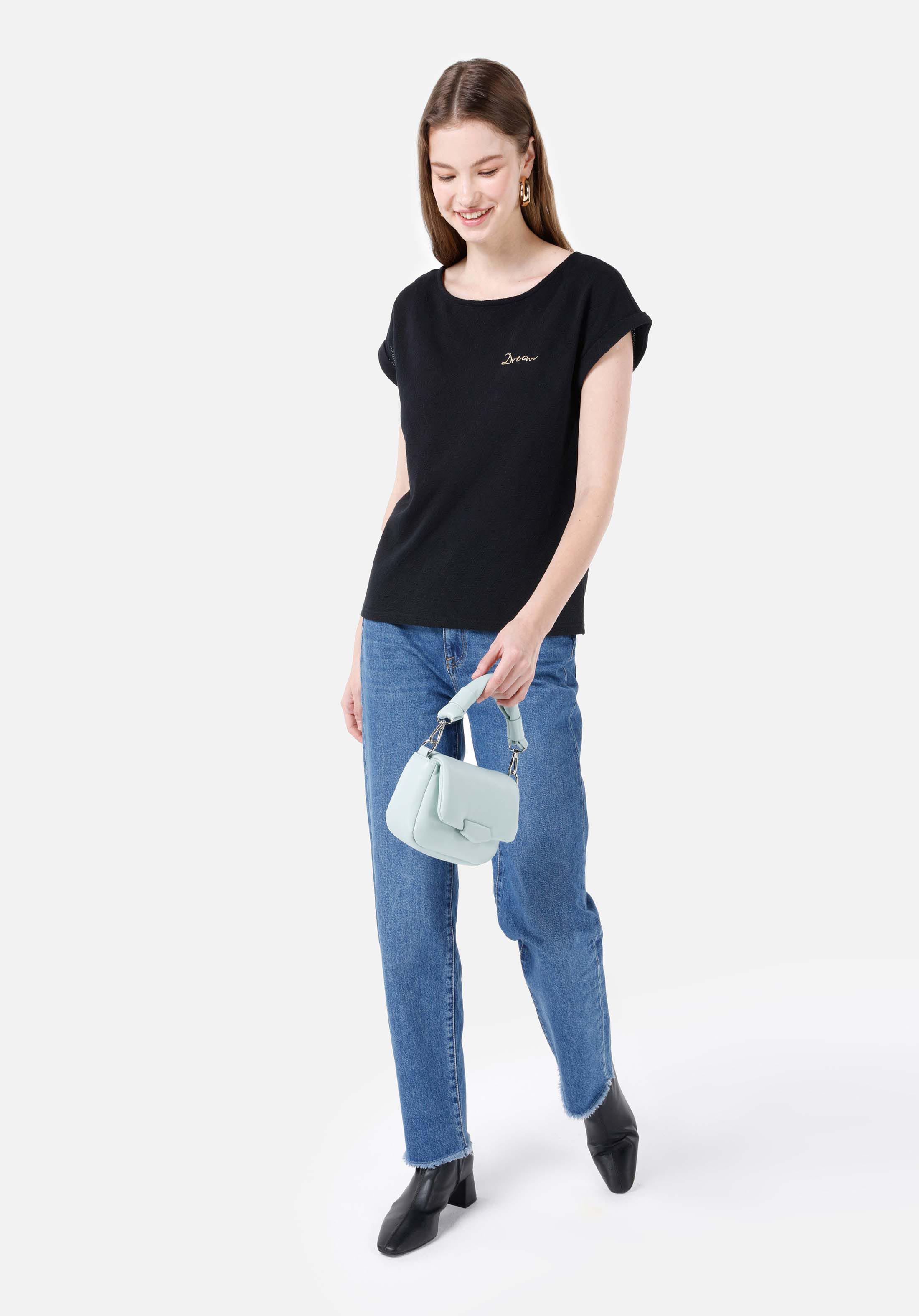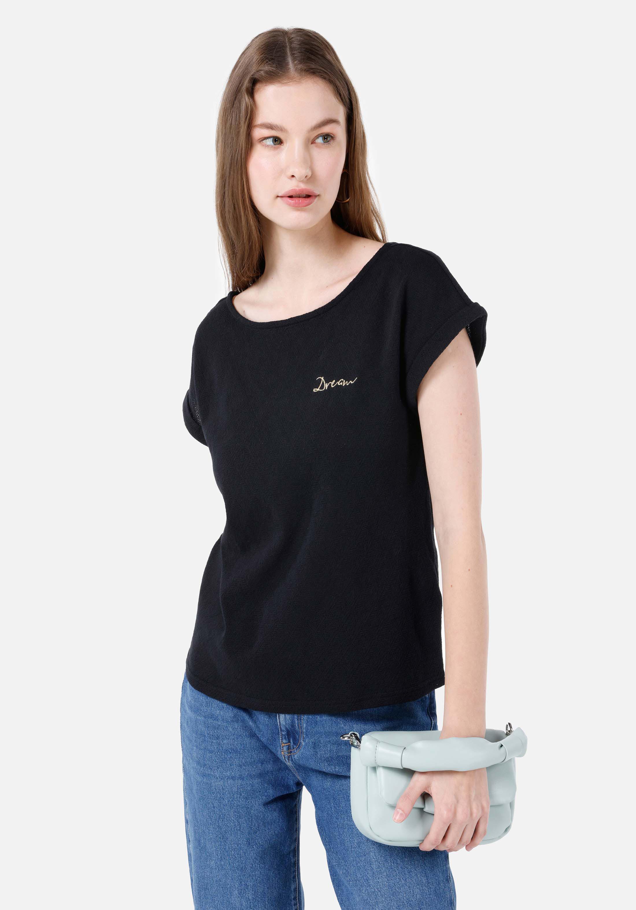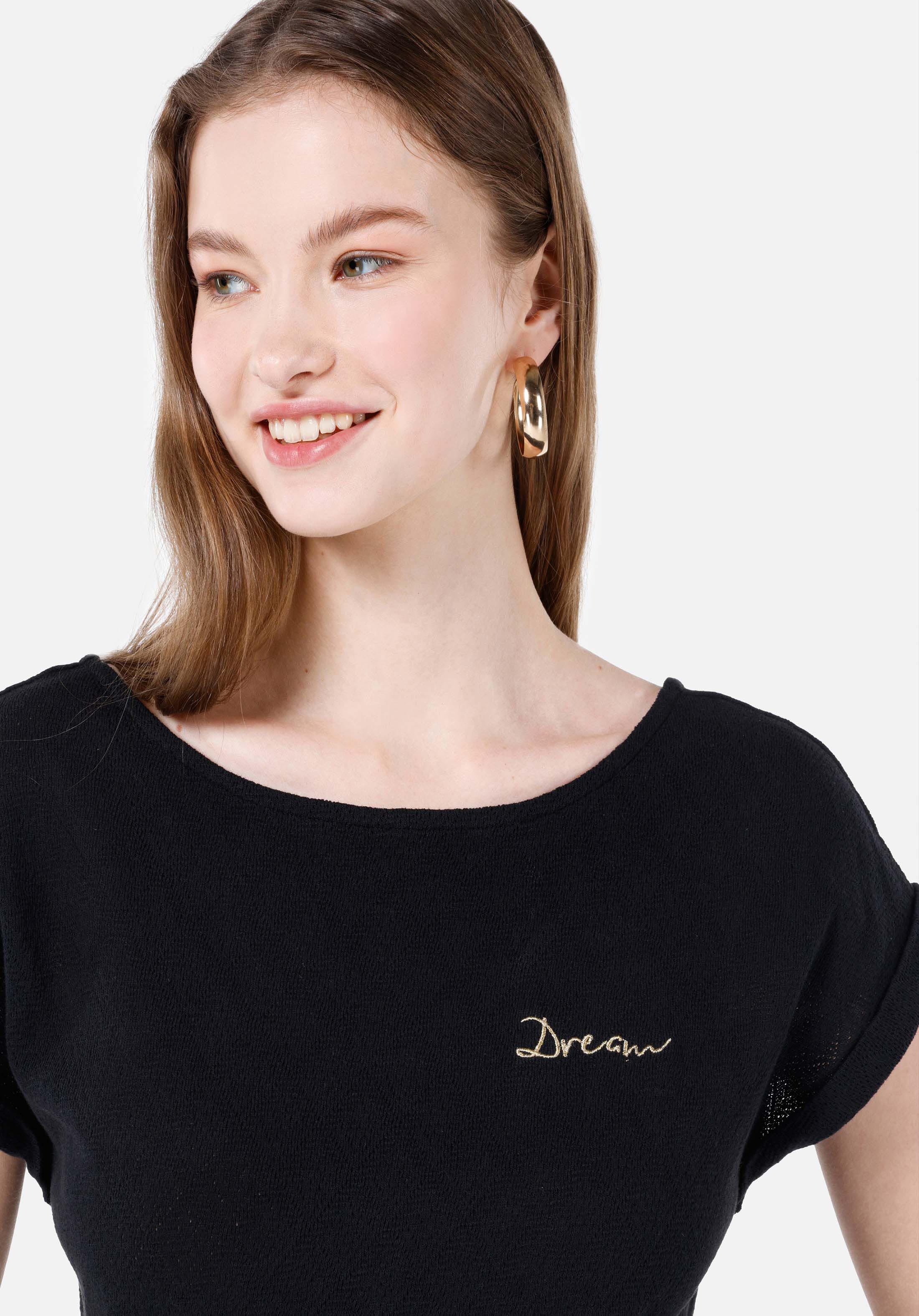 رقبة مستديرة مطبوعة نسائية أسود كم قصير تي شيرت