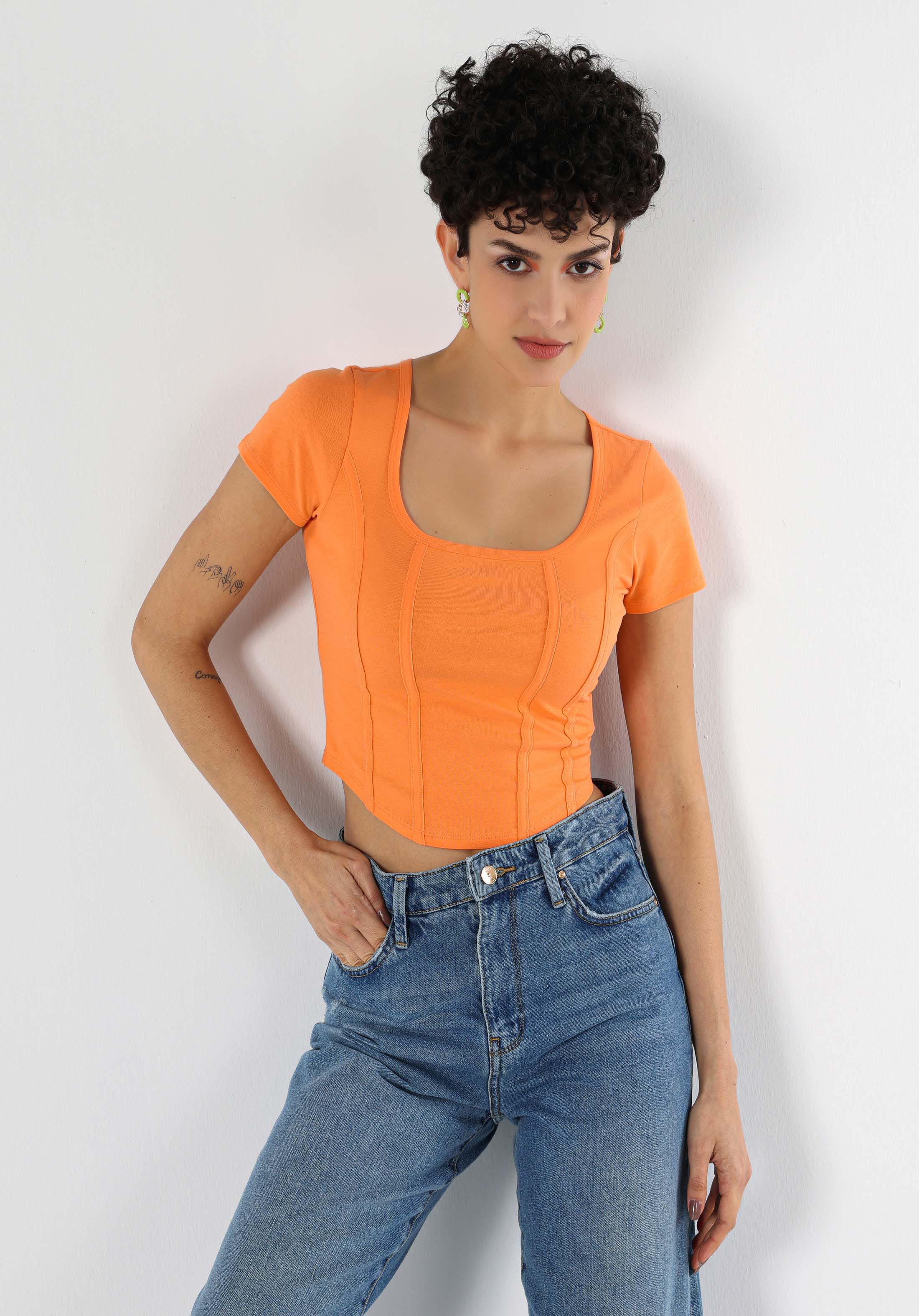 نحيف رقبة مربعة نسائي برتقالي كم قصير تي شيرت