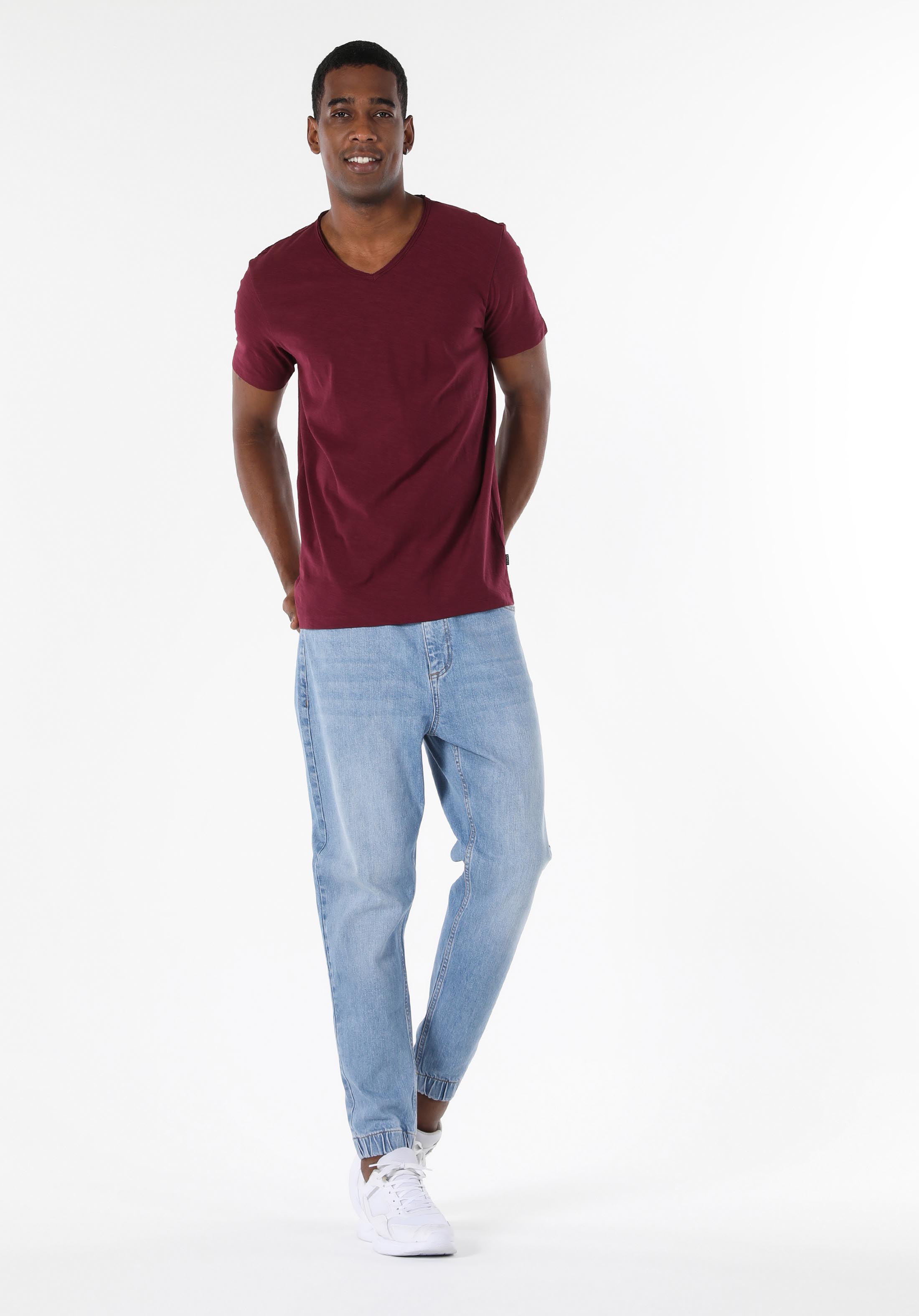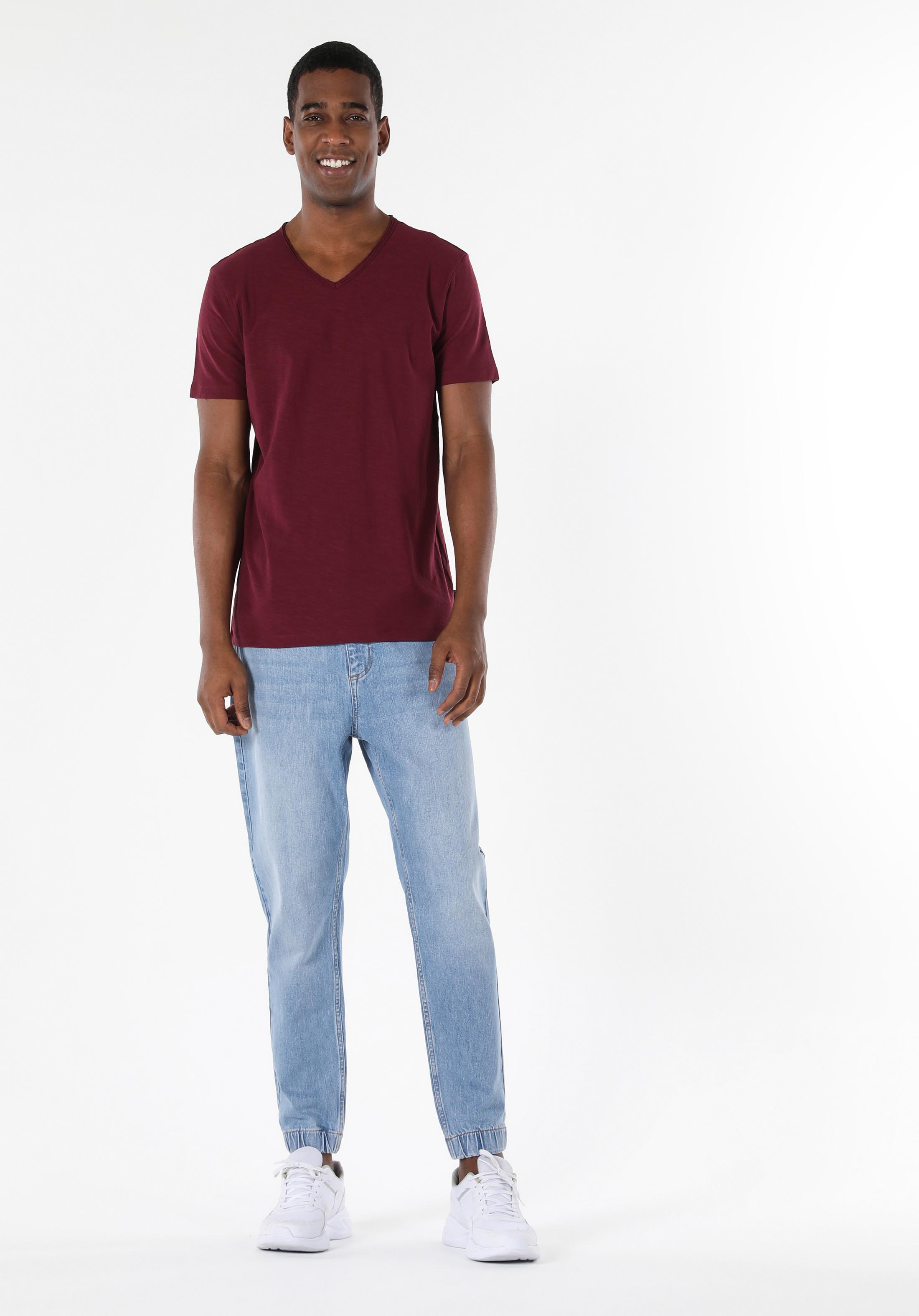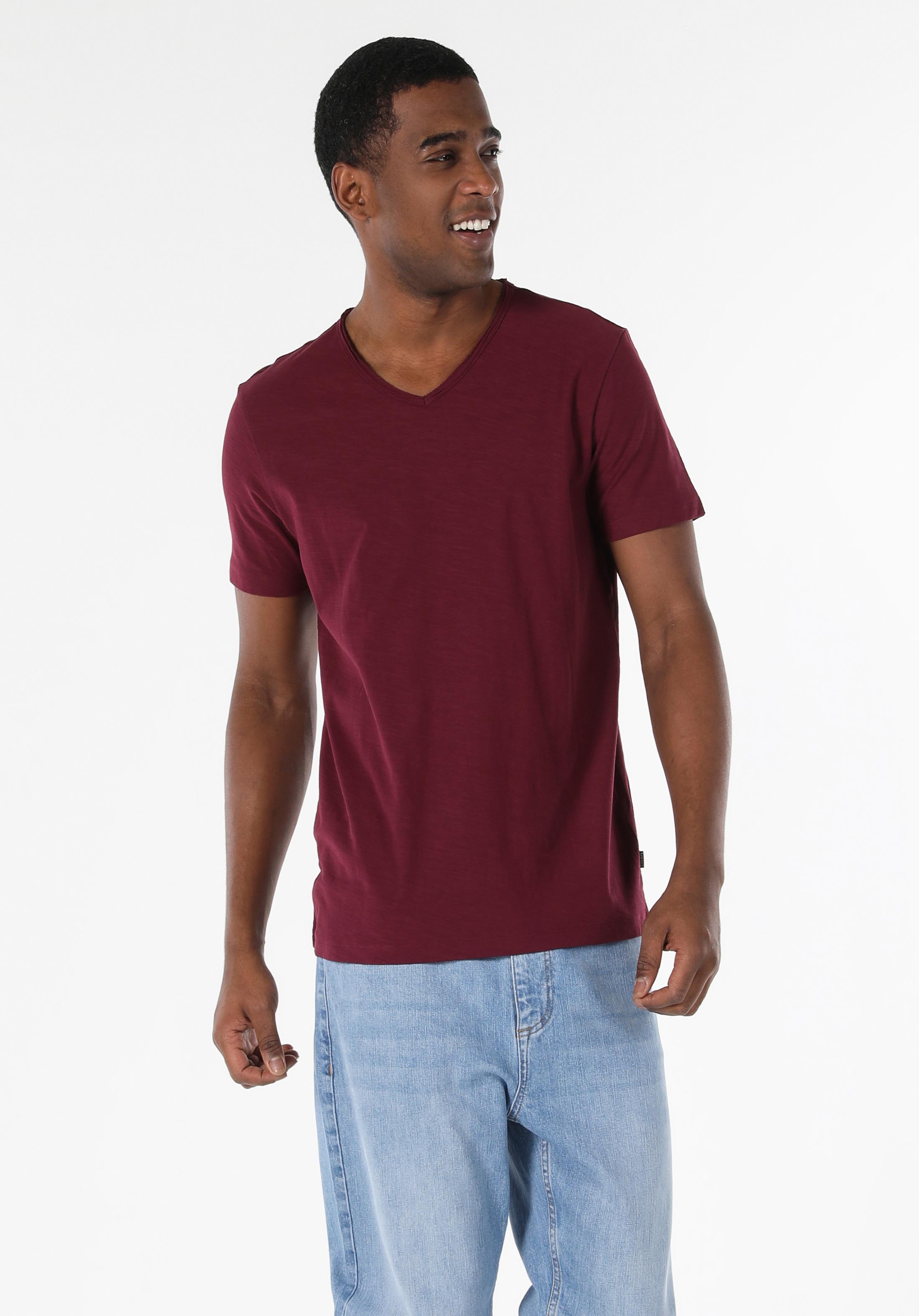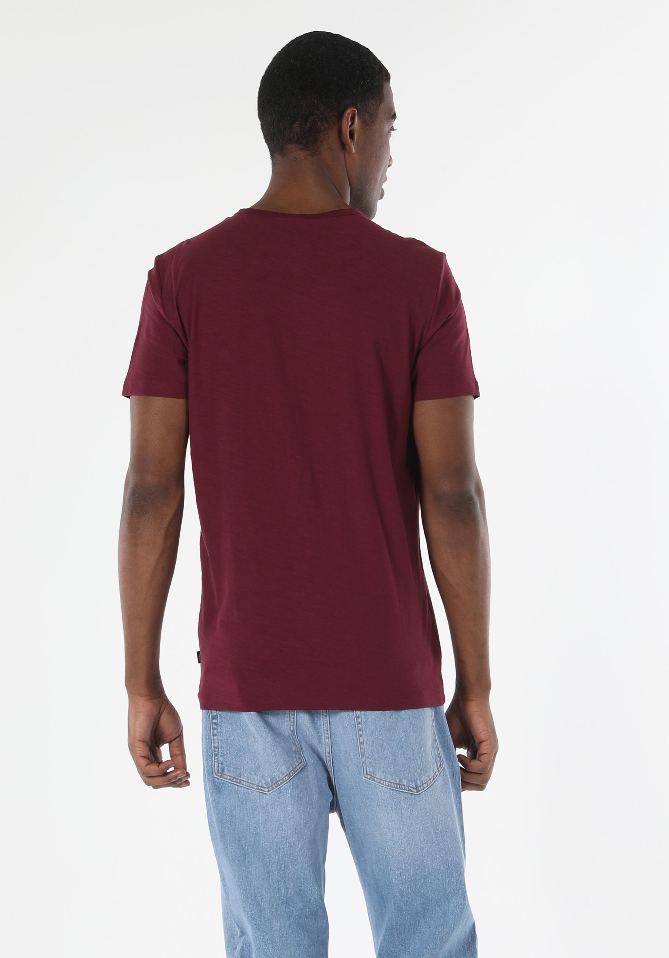 على شكل V رقبة مستقيم رجالي عنابي كم قصير تي شيرت