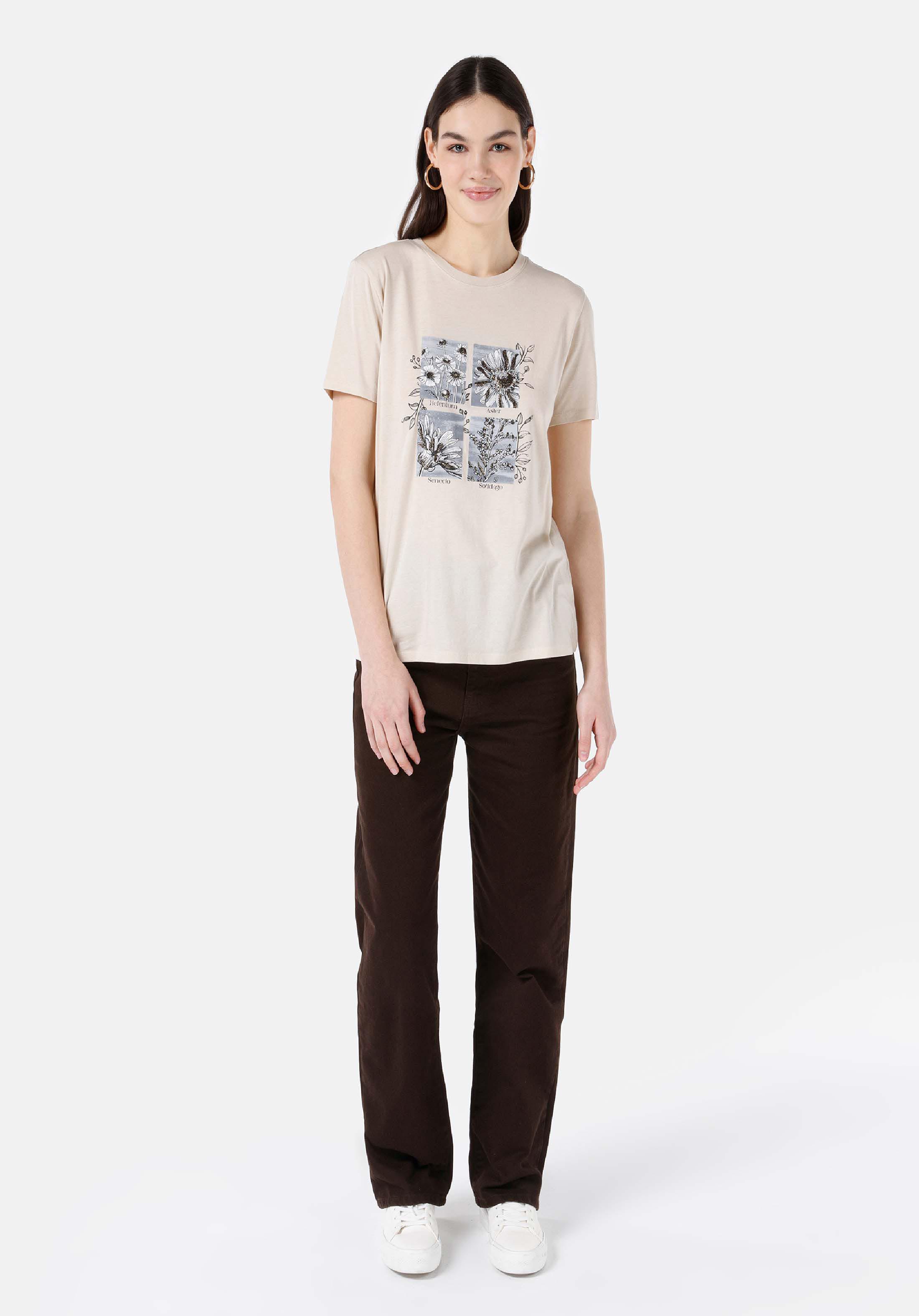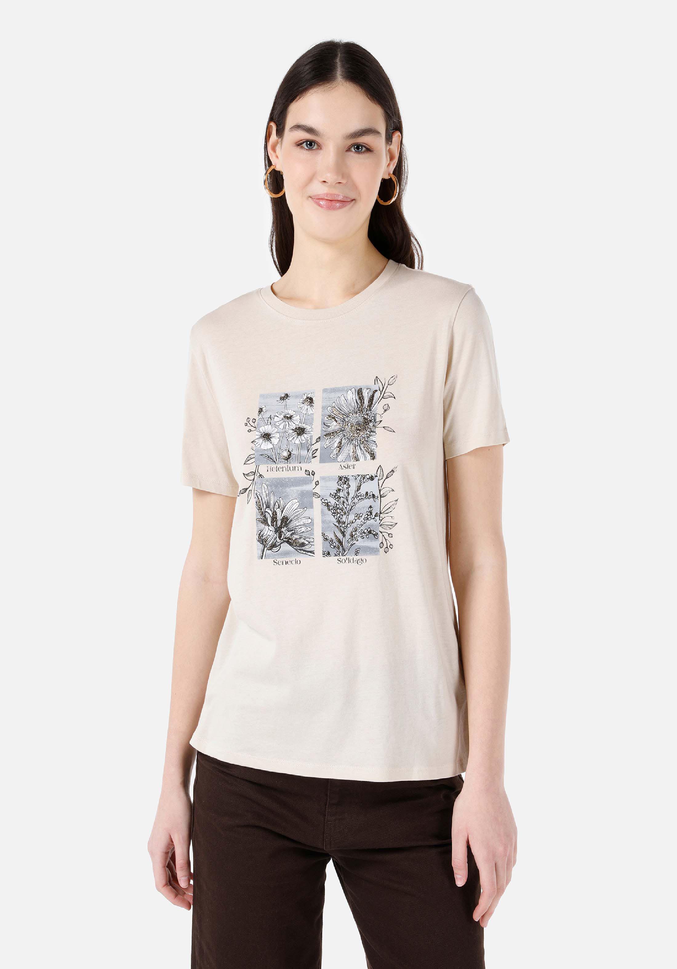 رقبة مستديرة مطبوعة نسائية بيج كم قصير تي شيرت