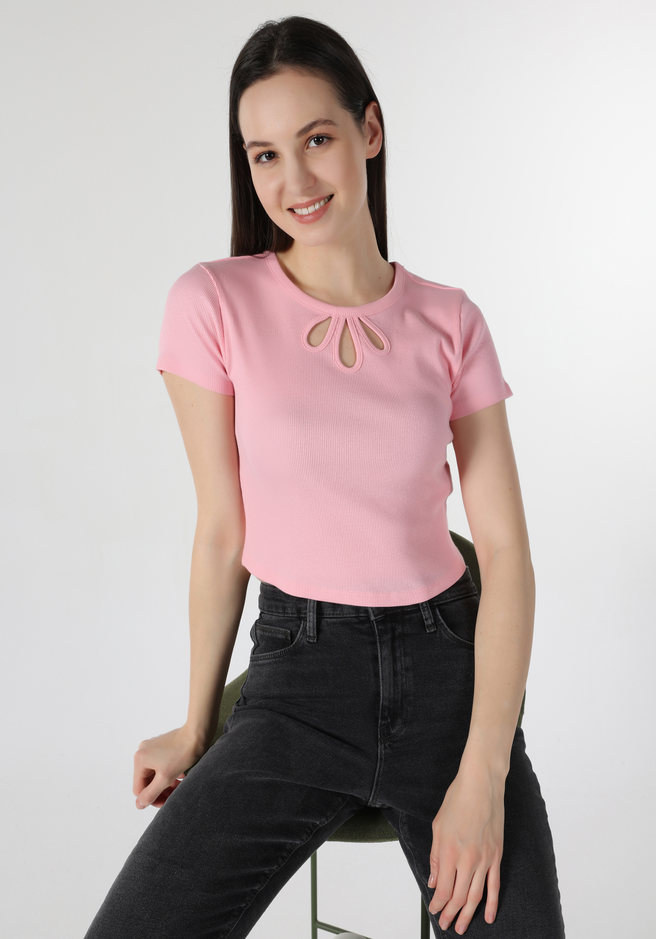 ضيق قصة رقبة مستديرة نسائي وردي كم قصير تي شيرت